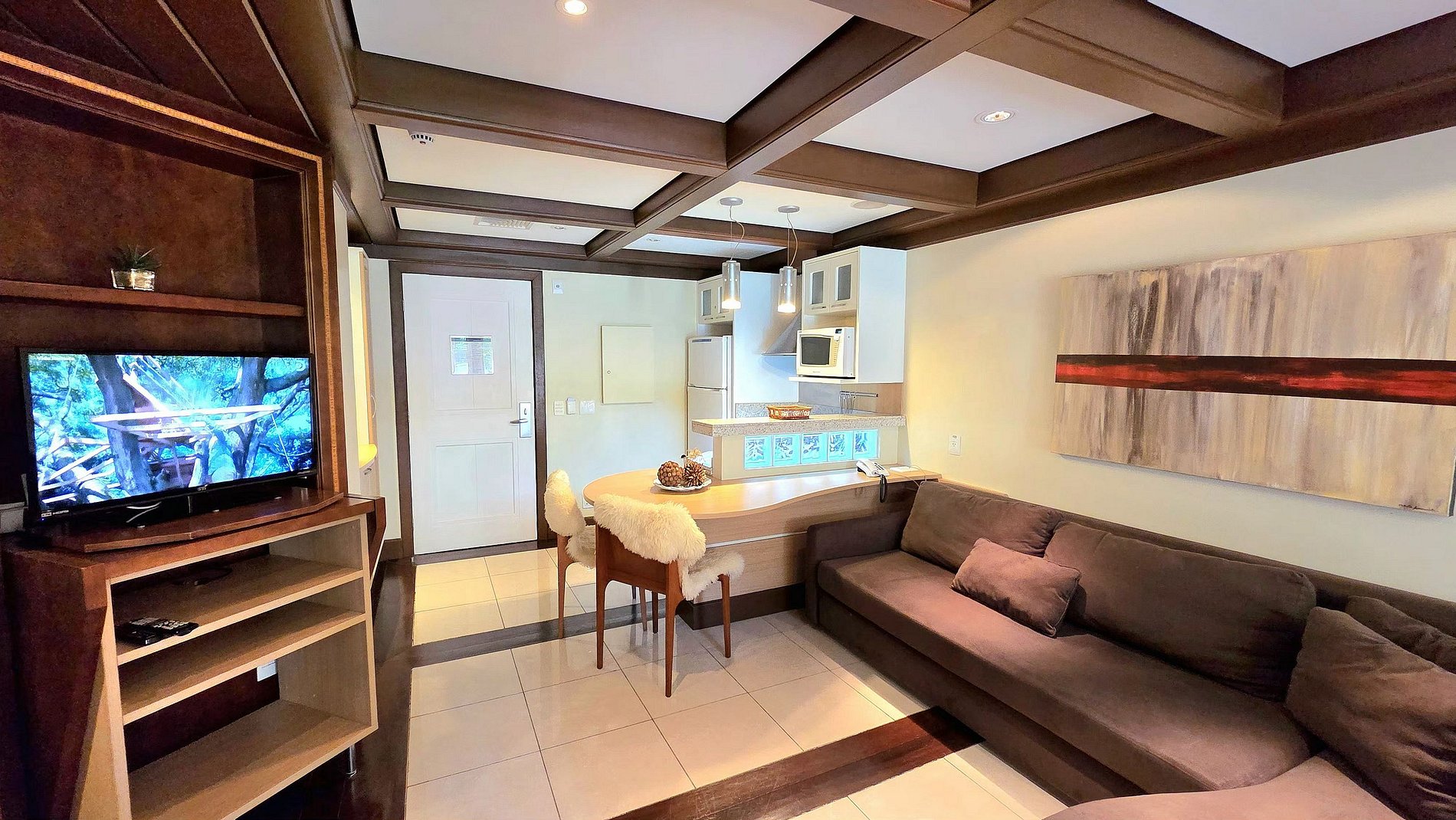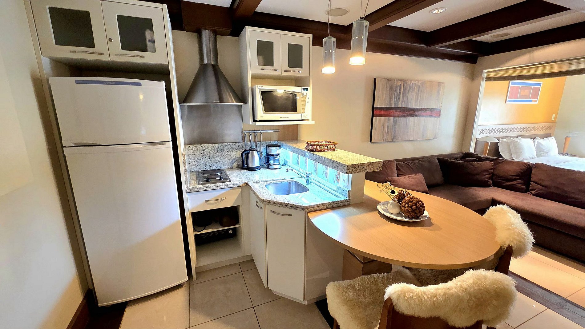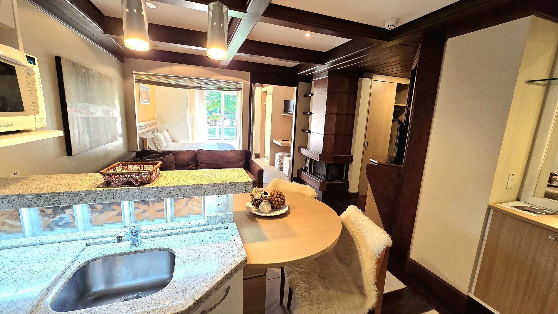 Aconchegante e Luxuoso Apto Studio, c/ quarto p/ casal, sala e cozinha, todo mobiliado em alto padrão. Comporta até 4 pessoas, moderno, c/ todos recursos disponíveis p/ tornar sua estadia memorável, junto às lindas vistas da Serra Gaúcha, c/ muito verde, opções de lazer e conforto. Possui banheira, iluminação ambiente, geladeira, cafeteira, lava louça, micro-ondas, forno elétrico e demais itens necessários para o espaço gourmet.