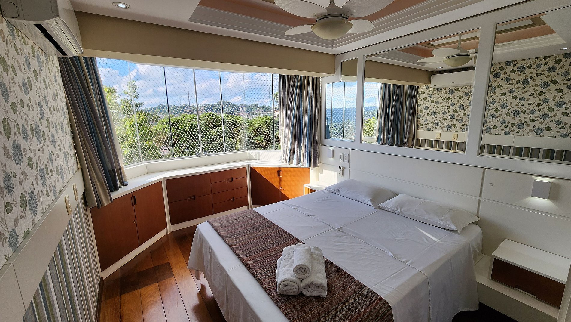 Sala ampla com 2 ambientes, 2 quartos (1 suíte), 2 camas Queen, 2 colchões de solteiro que podem formar mais 1 cama casal, sofá-cama e 1 berço desmontável. Possibilita hospedagem para até 7 pessoas (+ 1 bebê), confortavelmente. Sala e dormitórios possuem Ar Condicionado. Cozinha totalmente equipada com utensílios e eletrodomésticos. Lavanderia com tanque, lavadora, secadora e ferro elétrico. Suíte com cama Queen, closed, banheiro privativo, ar condicionado e uma linda vista para o Vale. Dormitório com cama Queen/box, roupeiro, TV Smart, Ar Condicionado, mais 2 colchões de solteiro e linda vista para o Vale. Banheiro social com secador de cabelo. A sala possui também linda vista para o Vale das Colinas. A lareira é somente decorativa. 1 Box de garagem coberta sob número 29, de fácil acesso à avenida. Apartamento ensolarado o dia inteiro em todas os ambientes e ótima ventilação. Prédio com elevador desde o andar das garagens e o apartamento fica no 2º andar. Localização central, não necessitando se deslocar de carro para os principais passeios de Gramado, entre eles, restaurantes, Rua Coberta, Mini-Mundo, Catedral, Palácio dos Festivais, Fonte do Amor, Lago Joaquina Rita Bier...