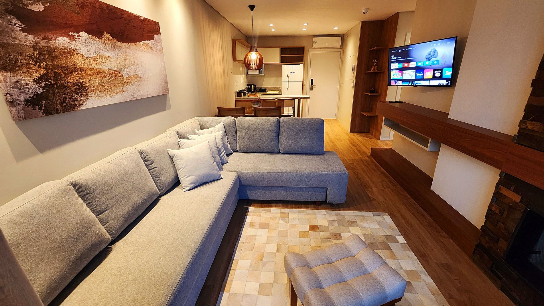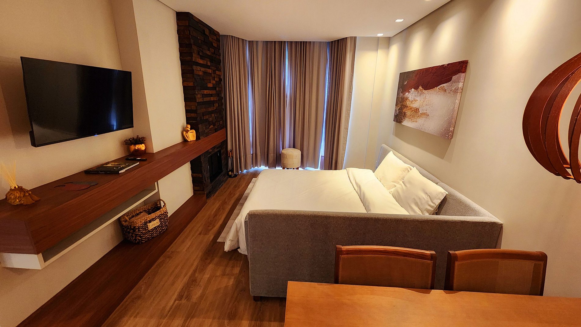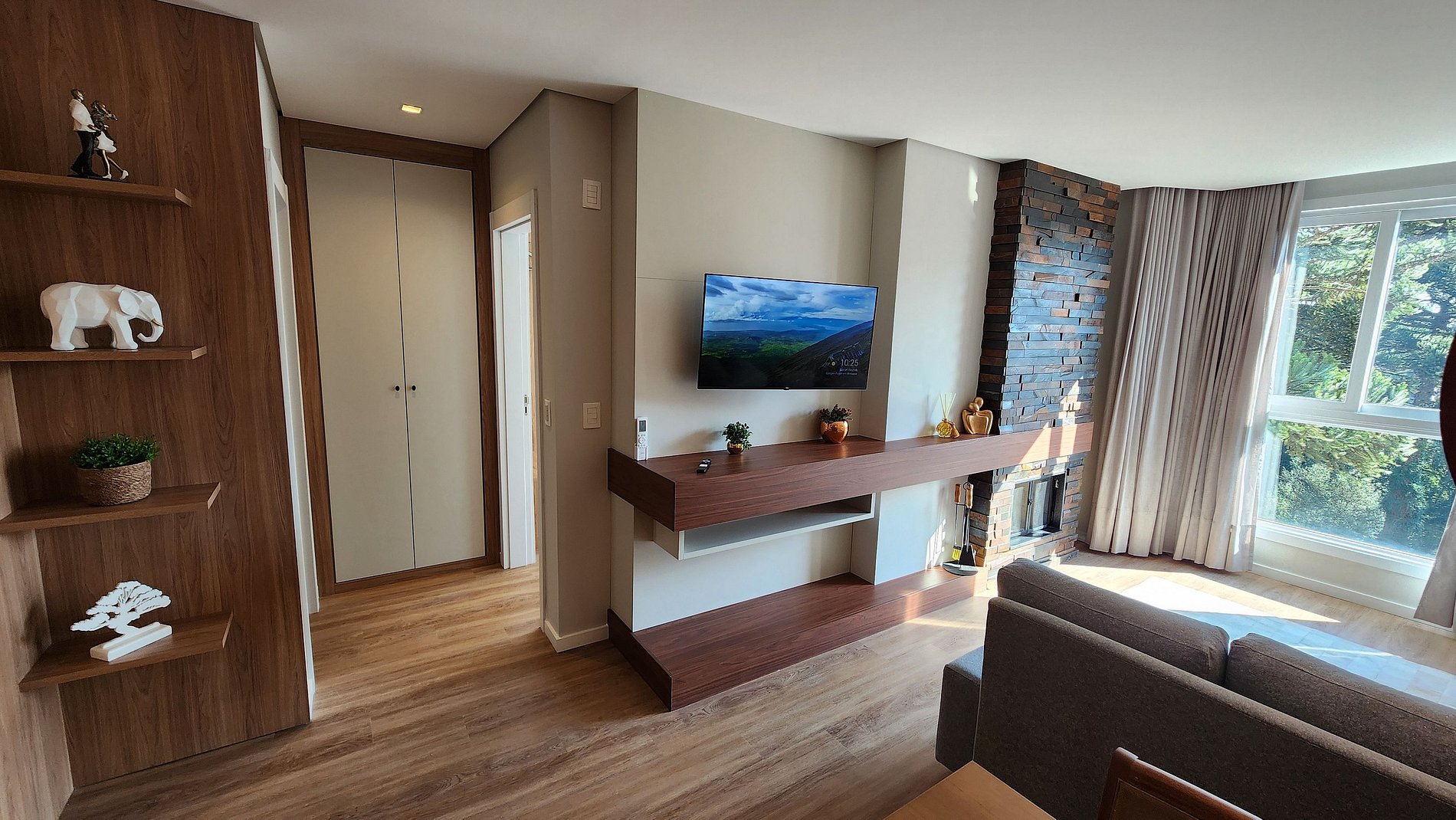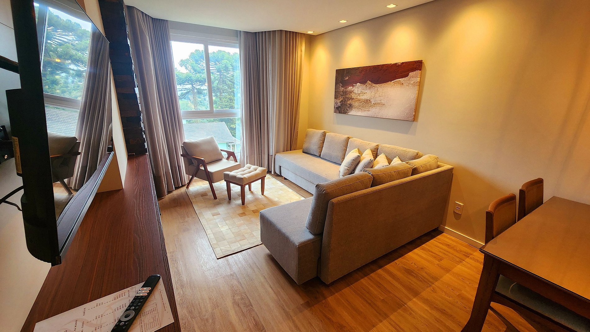 Divirta-se com toda a família neste lugar cheio de estilo. Espetacular Flat para até 5 pessoas, sala com 2 ambientes e lareira, cozinha equipada, todo mobiliado em alto padrão. Moderno, com todos os recursos disponíveis para uma estadia memorável. Possui a mais linda vista da cidade de Canela e Catedral de Pedra. Localizado em área nobre, rodeado de muito verde e linda vegetação