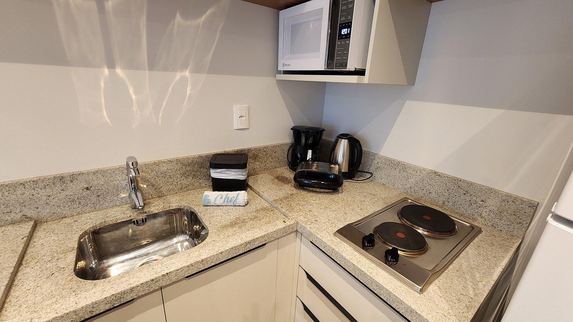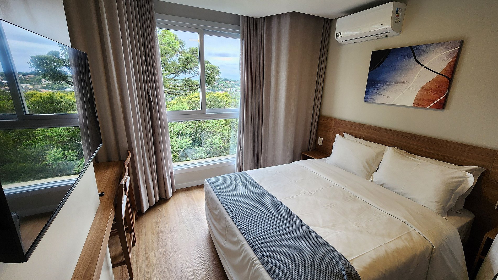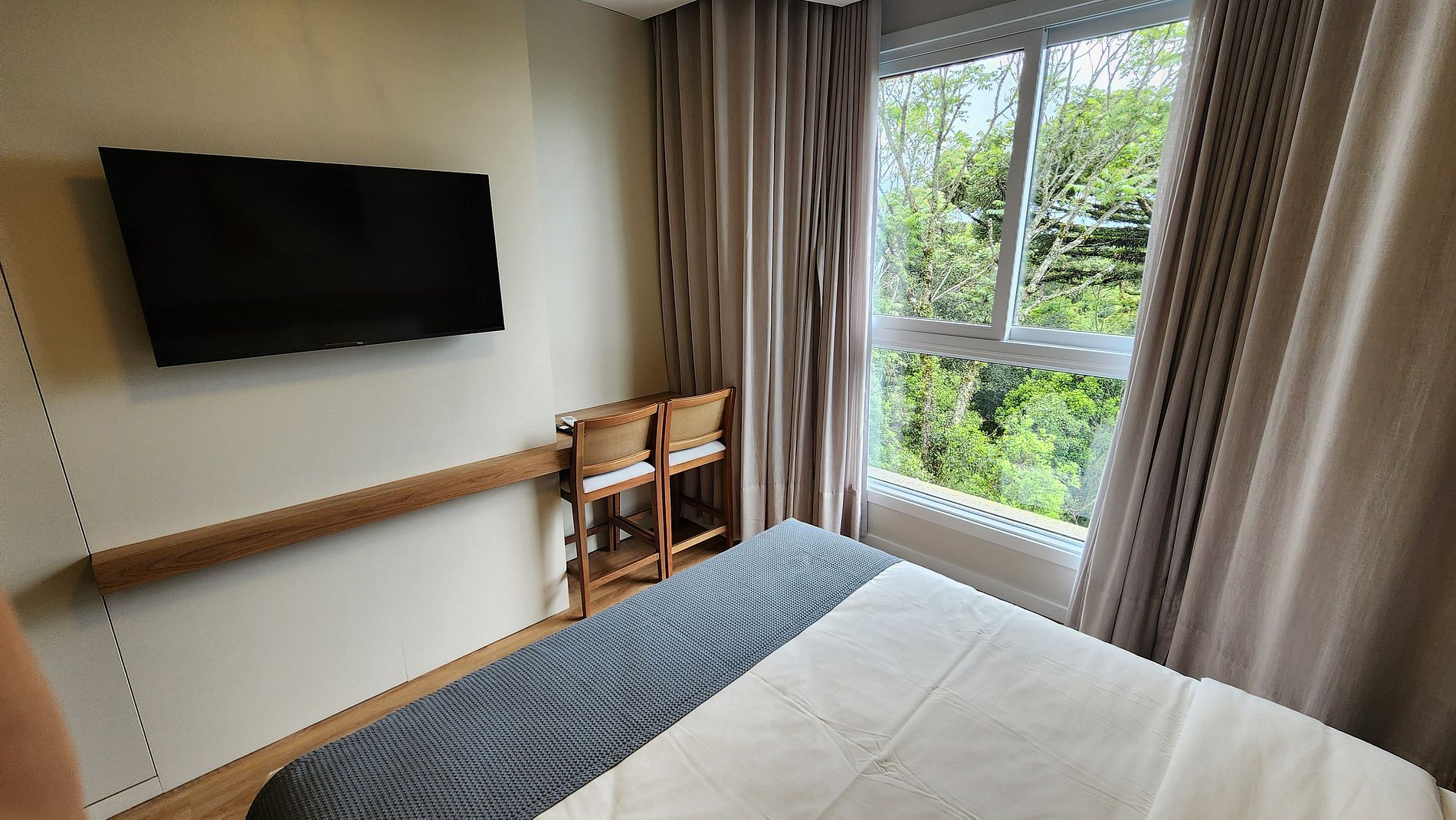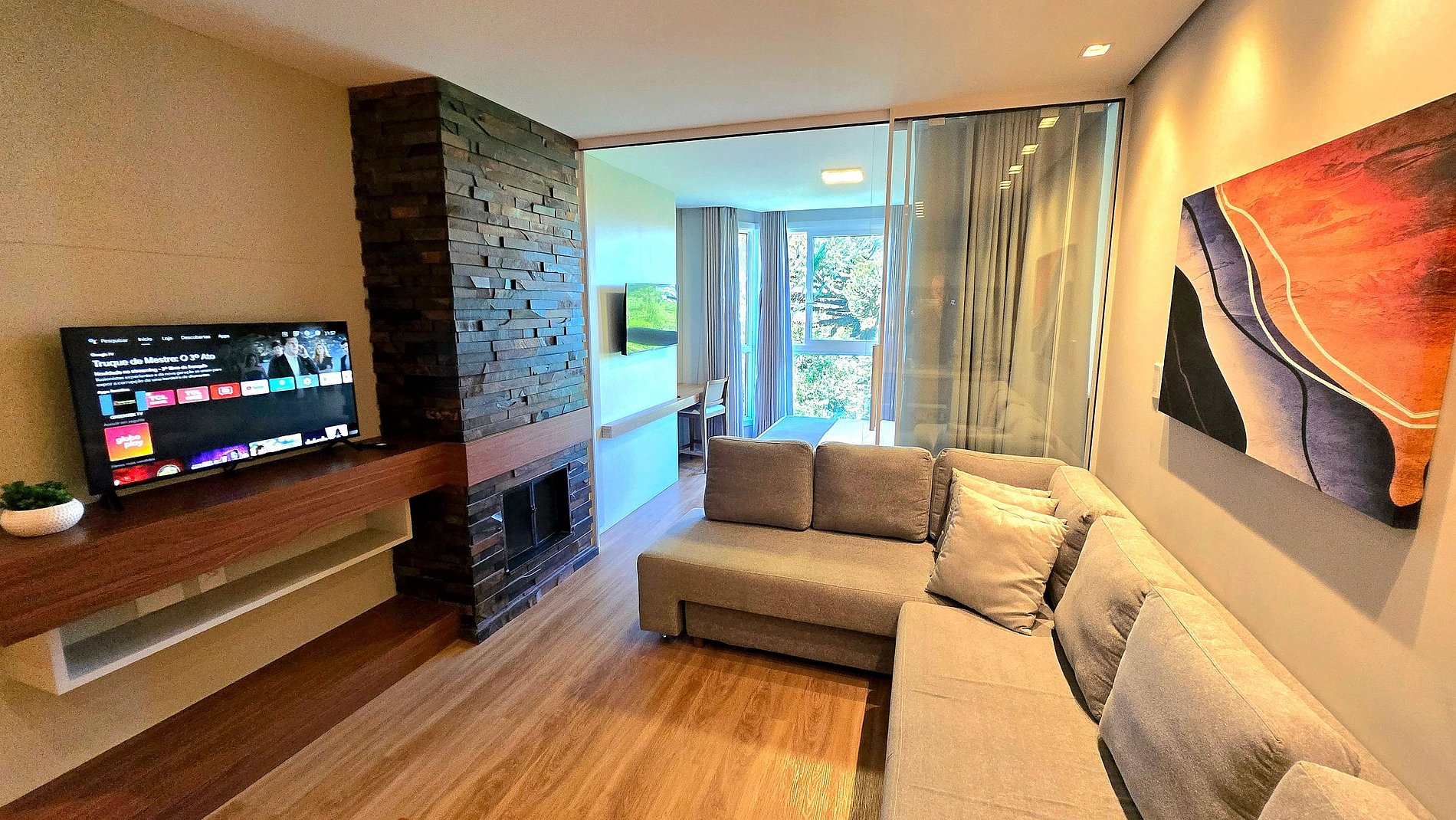 Espetacular Apartamento Studio, c/ quarto p/ casal, sala 2 ambientes, cozinha e banheiro com banheira de hidromassagem. Todo mobiliado em alto padrão, com uma vista maravilhosa. Moderno, c/ todos os recursos disponíveis p/ tornar a estadia memorável, junto às mais lindas vistas da Serra Gaúcha. Muito verde, opções de lazer e conforto ao seu redor. Tem banheira de hidromassagem, iluminação ambiente, geladeira, micro-ondas, etc.