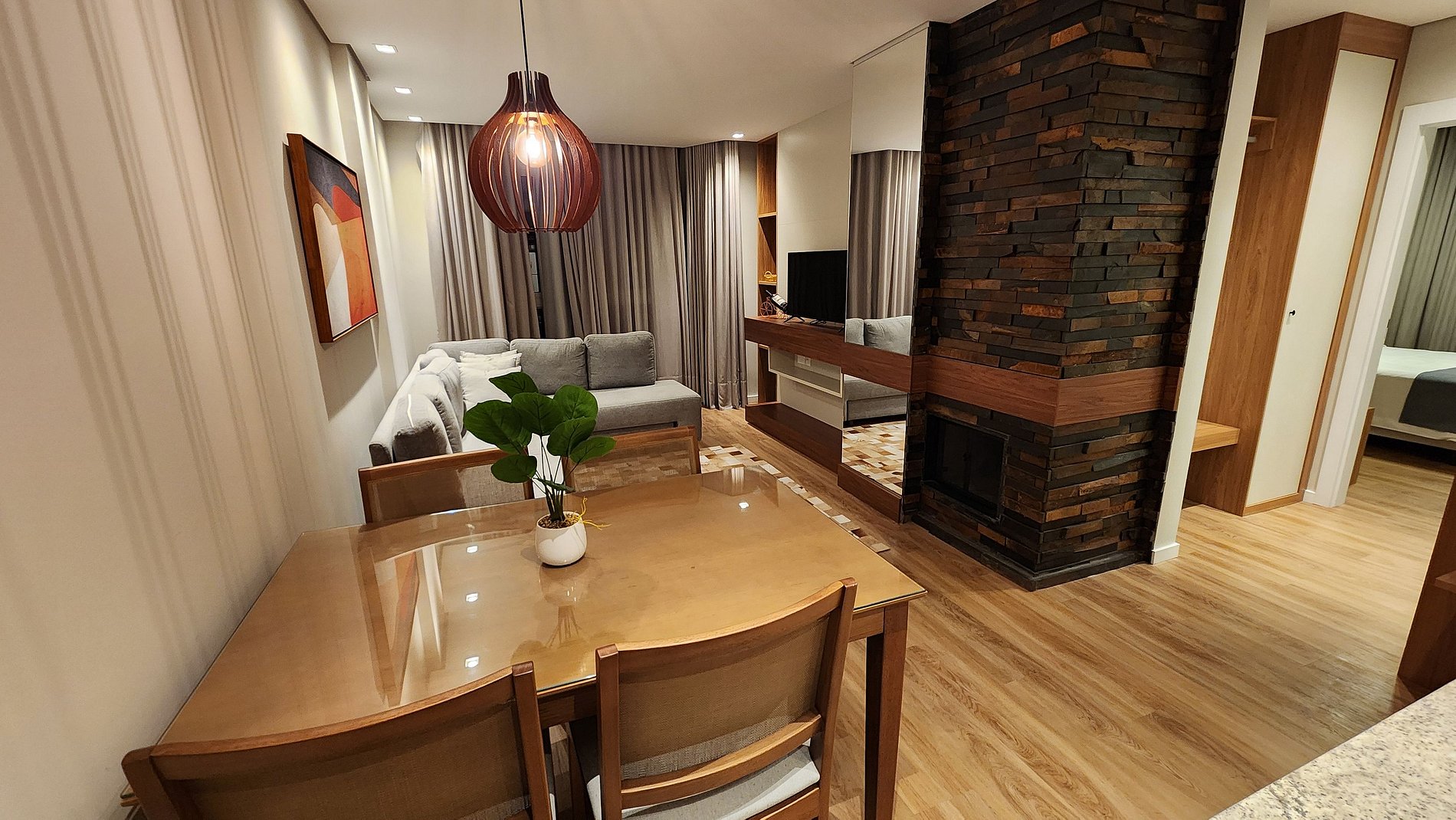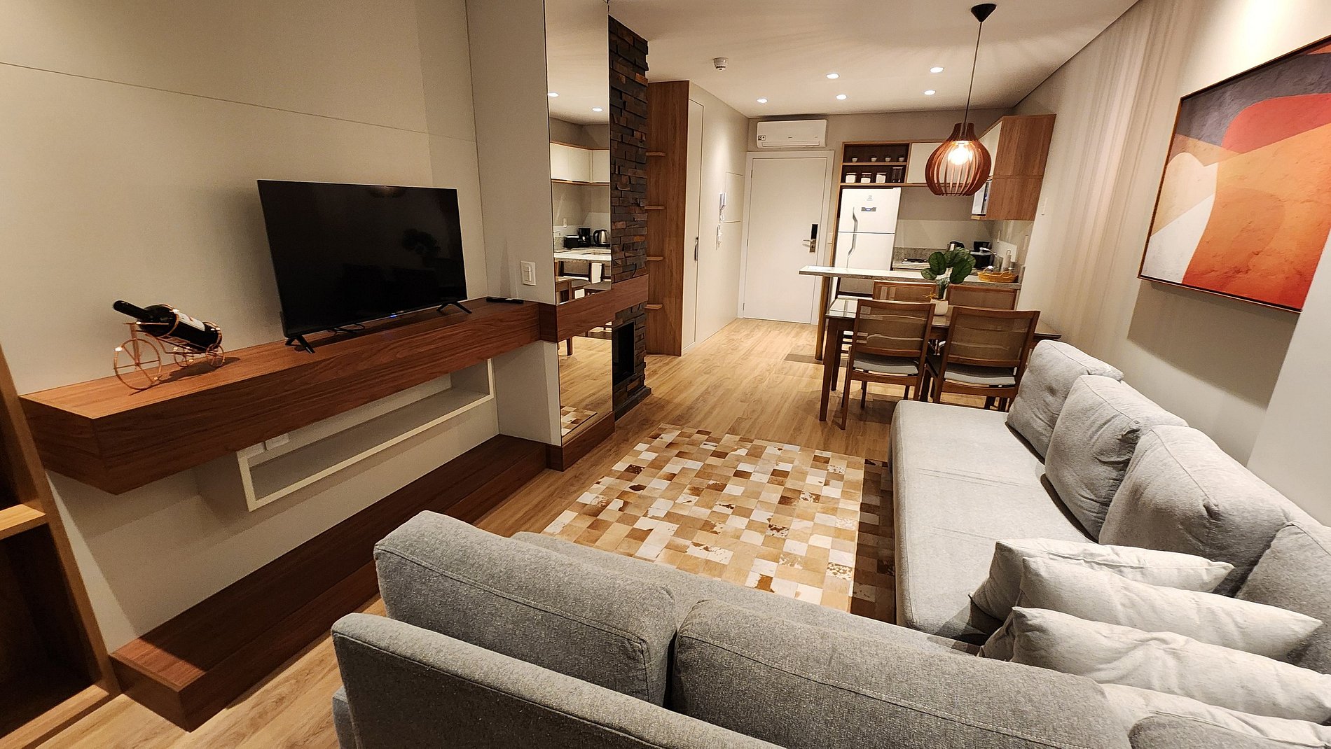 Espetacular Flat para até 5 pessoas, sala com 2 ambientes, lareira, banheira com hidromassagem, cozinha equipada, todo mobiliado em alto padrão. Moderno, com todos os recursos disponíveis para uma estadia memorável. Possui a mais linda vista da cidade de Canela e Catedral de Pedra. Possui no empreendimento piscina aquecida, sauna, academia, espaço kids, solarium e uma aconchegante sala com lareira. Localizado em área nobre, rodeado de muito verde e linda vegetação